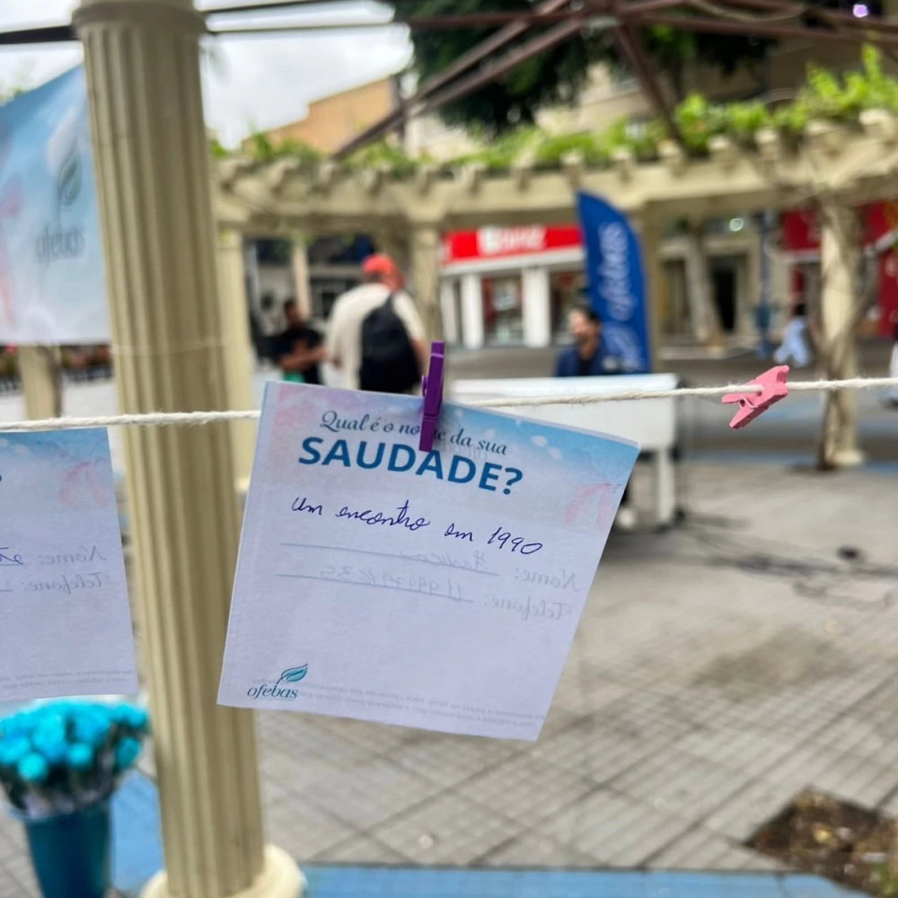 Saudade, uma palavra sem tradução literal em outros idiomas, foi o ponto de partida da ação realizada pela Ofebas na manhã desta quinta-feira (30), na Praça Coronel Fernando Prestes. Realizada pelo segundo ano seguido, a iniciativa marcou o Dia da Saudade e convidou a população a homenagear pessoas e memórias por meio do Varal da Saudade, em um momento de acolhimento e reflexão.